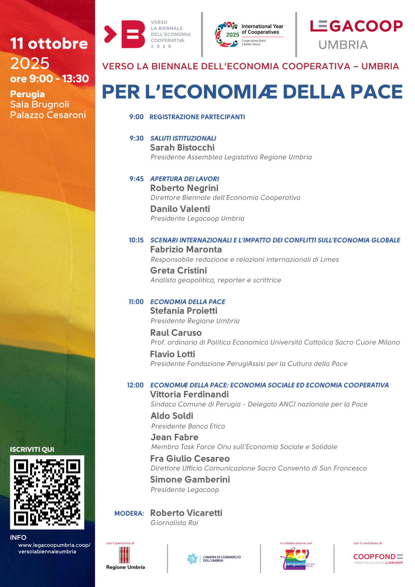 Nel percorso della Biennale dell’Economia Cooperativa, Legacoop Umbria promuove una riflessione sull’ Economia di Pace, intesa come sviluppo fondato su dialogo, inclusione e partecipazione democratica.